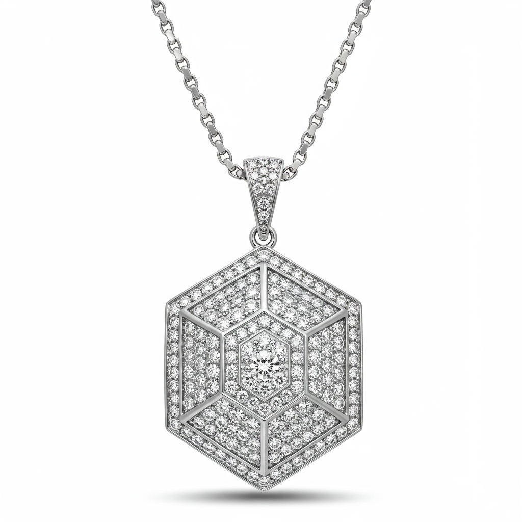This powerful Men's Necklace embodies modern masculinity through architectural design and unmatched brilliance. Crafted in lustrous 18KT white gold, the robust geometric pendant is meticulously adorned with pave-set VVS diamonds. It provides a striking balance of contemporary style and timeless luxury, perfect for the discerning man. This piece is designed to be a definitive statement accessory, reflecting strength and sophistication.