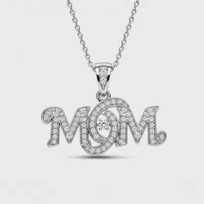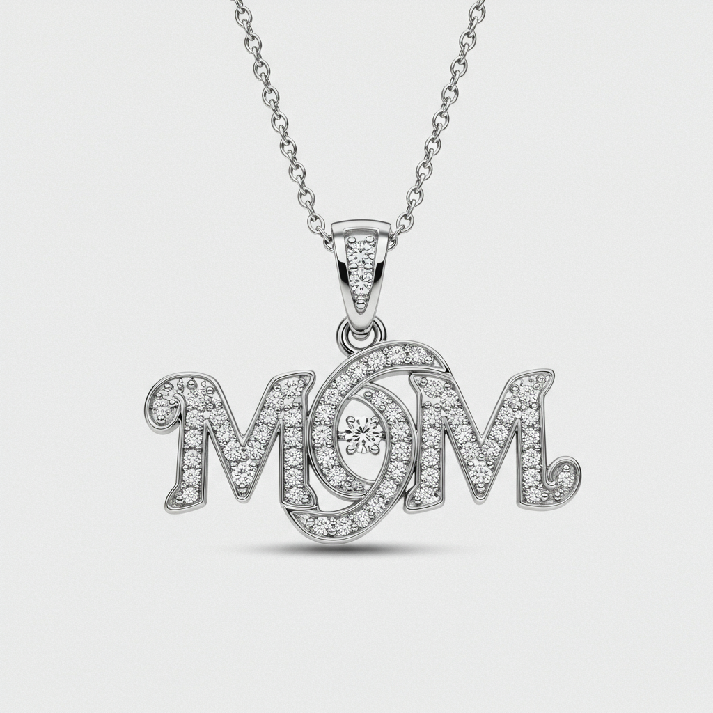 The Mom Necklace is a heartfelt tribute, meticulously crafted in luxurious 18KT white gold. The delicate script pendant spells out 'MOM', entirely set with brilliant pave diamonds. These VVS clarity stones catch the light with unmatched sparkle, symbolizing the eternal bond of motherhood. This piece offers both enduring elegance and deep personal meaning, making it the perfect heirloom gift.