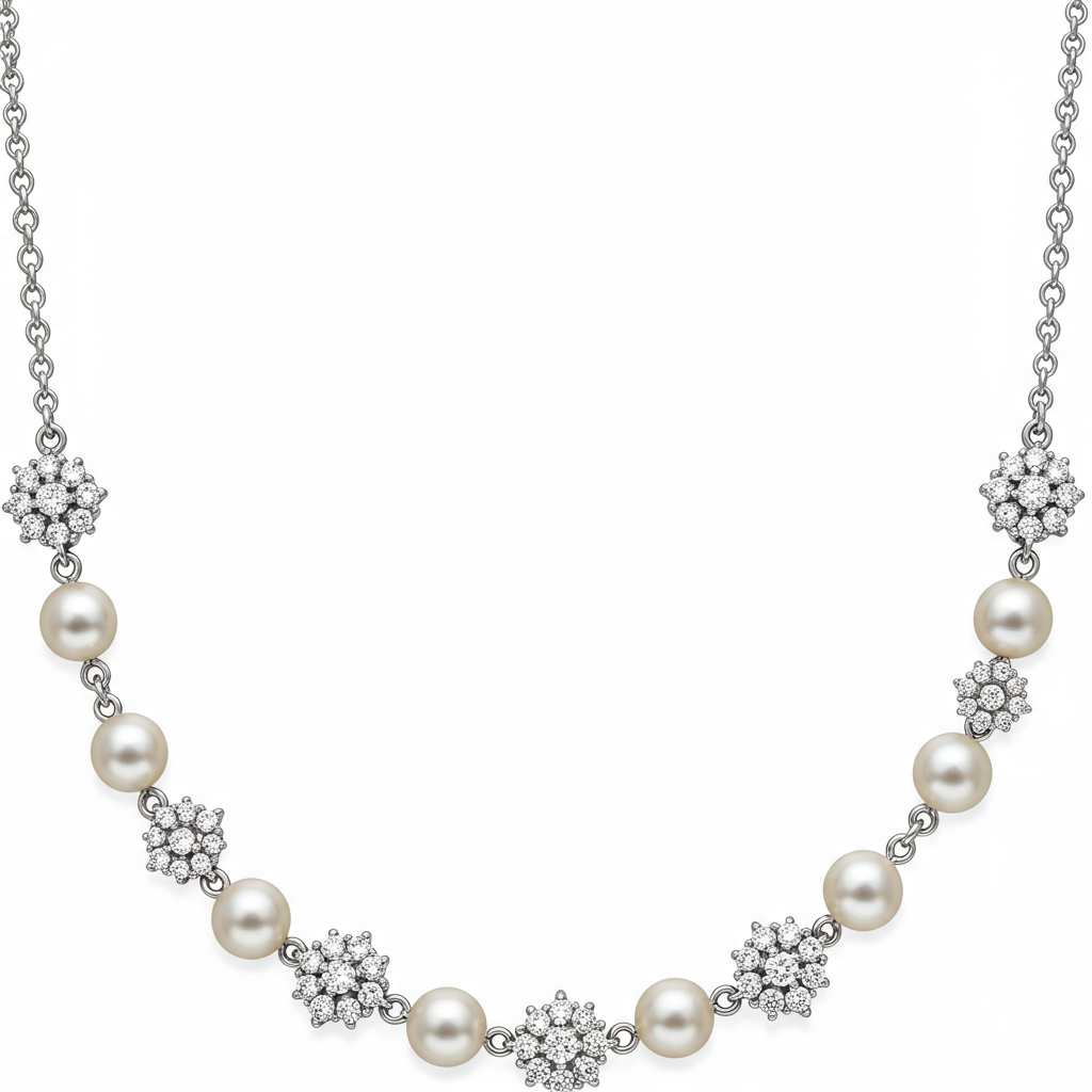 The Pearl Necklace And is an exquisite contemporary masterpiece, balancing the classic allure of cultured pearls with the brilliance of natural diamonds. Featuring alternating stations of luminous Akoya pearls and dazzling diamond clusters set in luxurious 18KT white gold. This elegant piece is designed to drape gracefully, offering timeless sophistication for both formal occasions and everyday luxury. Its refined detailing ensures a spectacular sparkle, making it a truly cherished addition to any fine jewelry collection.