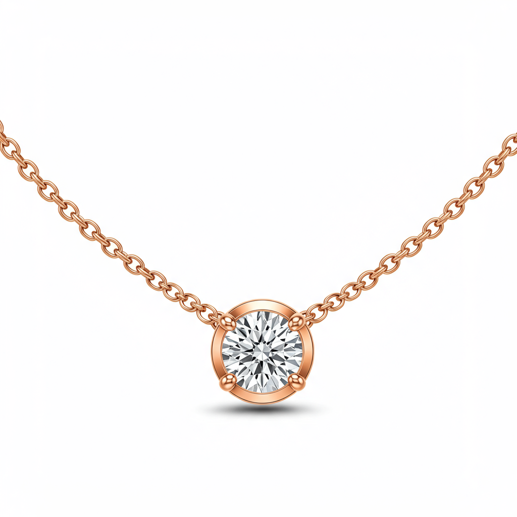 The Rose Gold Solitaire Necklace embodies refined elegance and contemporary romance. Crafted in luxurious 18KT rose gold, this piece features a dazzling round brilliant diamond secured in a minimalist four-prong setting, allowing maximum light exposure. The soft blush tone of the gold complements the diamond's brilliance, creating a timeless yet modern aesthetic. This necklace is the perfect signature piece, designed to rest gracefully upon the collarbone for everyday luxury or special occasions.