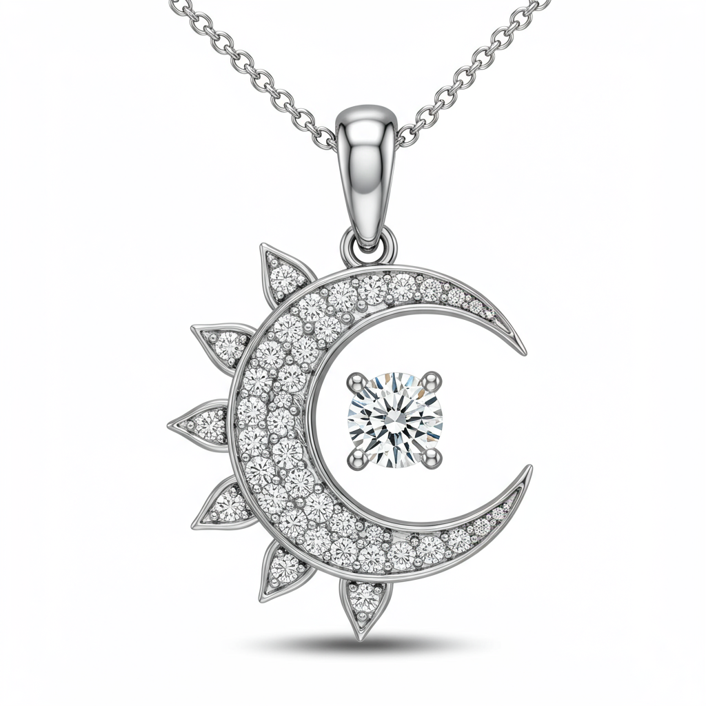 The Sun Moon Necklace is a breathtaking tribute to celestial harmony, meticulously crafted in luminous 18KT white gold. This iconic design features two distinct, interconnected motifs symbolizing balance and eternity. The sun is detailed with brilliant micro-pave set round diamonds, while the crescent moon holds a striking central diamond accent, completing the duality of the piece. Wear this exquisite pendant as a sophisticated reminder of the universe's infinite beauty and sophisticated duality.