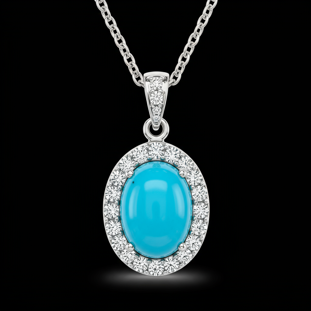 This exquisite pendant captures the serene beauty of the ocean with a stunning oval natural Turquoise centerpiece, suspended delicately from a fine chain. Surrounded by a brilliant halo of micro-pave set VVS diamonds, the design offers unmatched radiance and sophistication. Crafted in polished 18KT white gold, this necklace is a true statement of elegance and timeless style. It is the perfect piece to elevate any ensemble, transitioning flawlessly from daywear to evening glamour.