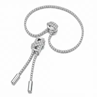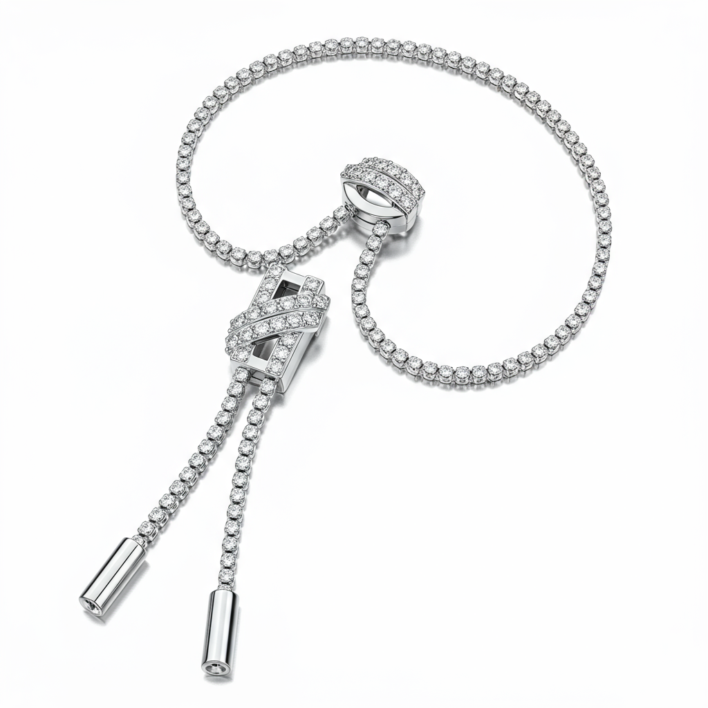 The Bolo Necklace offers contemporary elegance with its infinitely adjustable design. Crafted in luminous 18KT white gold, the slender chain feeds through a dazzling diamond-encrusted slider mechanism. This piece features precision-set VVS diamonds, creating a continuous line of brilliance that moves fluidly with the wearer. Perfect for layering or wearing solo, it allows for custom length adjustment to suit any neckline or style, making it a truly versatile luxury staple.