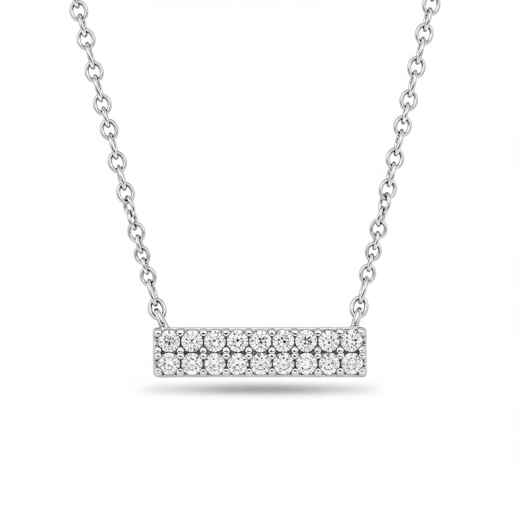 The Diamond Bar Necklace embodies minimalist elegance, featuring a sleek horizontal bar meticulously set with brilliant pave diamonds. Crafted in lustrous 18KT white gold, this modern piece provides continuous sparkle that catches the light from every angle. It serves as a sophisticated everyday statement or a versatile layering foundation. This timeless design is secured by a fine, adjustable chain, symbolizing contemporary grace and refined taste.