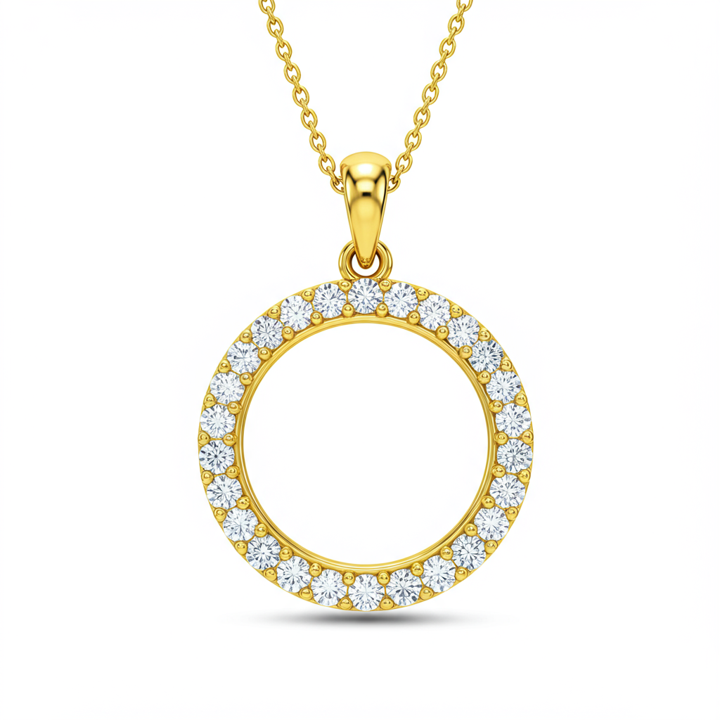 This exquisite necklace features a perfect circle, meticulously paved with brilliant round diamonds, symbolizing eternal love and continuity. Crafted in radiant 18KT yellow gold, the minimalist design offers sophisticated elegance suitable for daily wear or special occasions. The meticulous setting ensures maximum light reflection, giving the pendant an unparalleled sparkle. It hangs gracefully from a delicate yet strong cable chain, creating a balanced and timeless look.