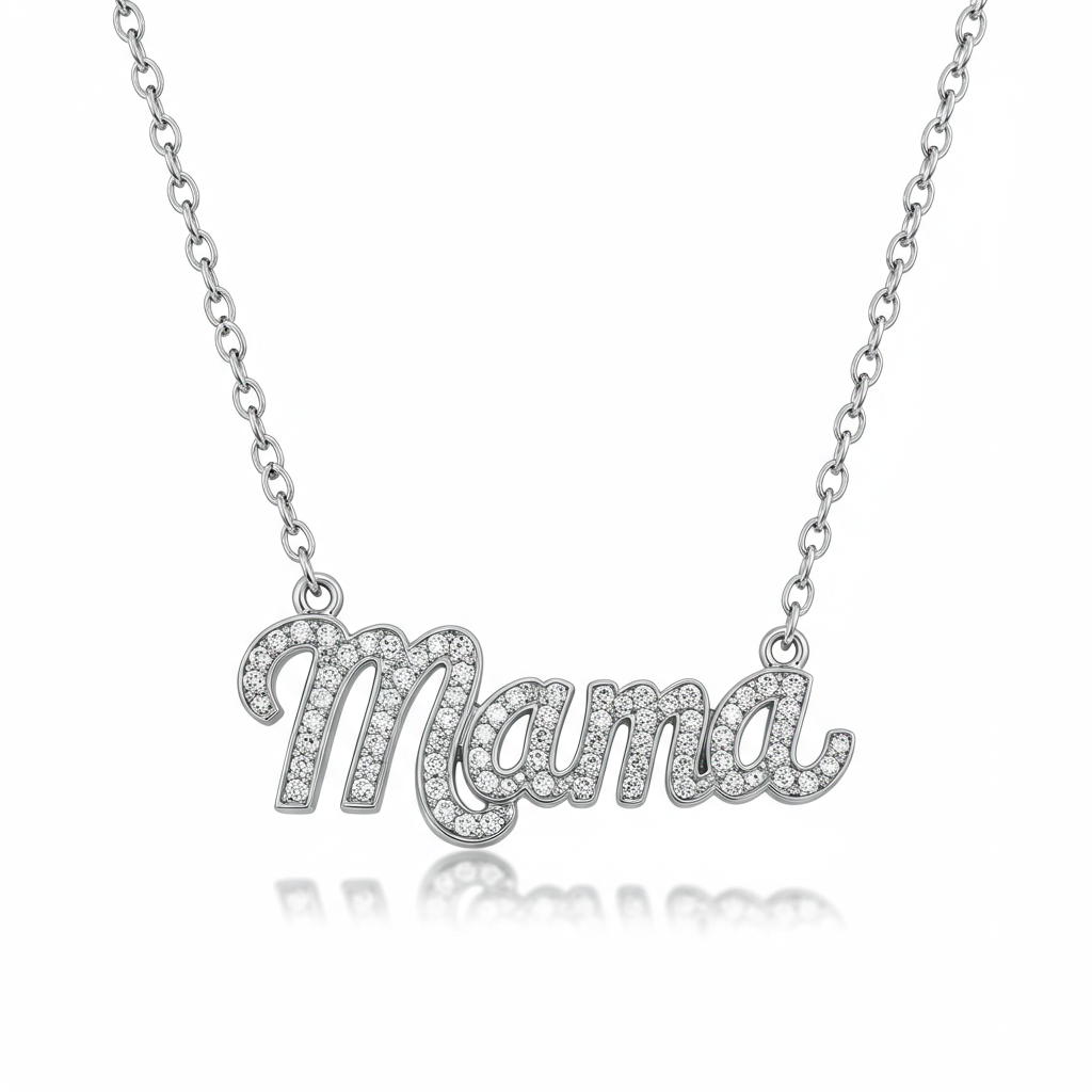 The Mama Necklace is a timeless expression of maternal love, crafted in luminous 18KT white gold. This elegant script pendant is meticulously set with brilliant-cut, high-clarity diamonds, emphasizing the delicate curves of the word "Mama." Designed for daily wear, this piece serves as a sophisticated tribute to the most important woman in one's life. It is the perfect heirloom piece, symbolizing an unbreakable bond.