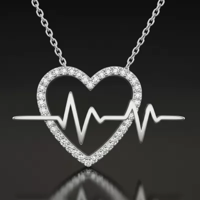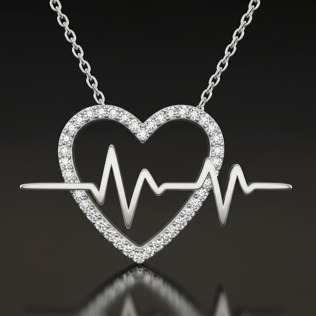 The Heartbeat Silver Necklace is a testament to eternal romance, crafted meticulously in luminous 18KT white gold. Its delicate heart-shaped silhouette is brilliantly illuminated by a precise array of VVS G-color round diamonds set in a secure micro-pave setting. This elegant pendant captures the rhythm of love, providing continuous sparkle and sophisticated grace. Suspended from a slender, adjustable chain, this piece is perfect for daily wear or as a cherished gift.