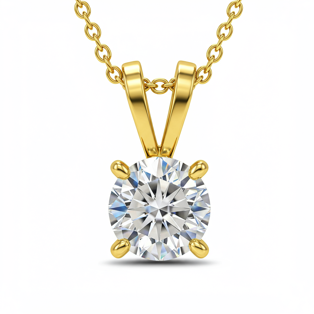 This exquisite pendant necklace showcases timeless elegance, meticulously crafted in luxurious 18KT yellow gold. A brilliant solitaire diamond, held securely in a refined four-prong setting, captures and reflects light dramatically. The design emphasizes sophisticated simplicity and luxury, making it an ideal choice for daily wear or formal events. This piece serves as a true testament to minimalist high-end jewelry design.