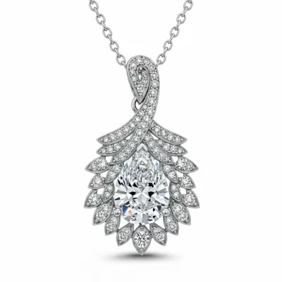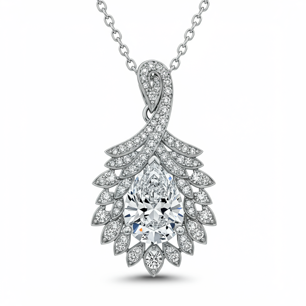 The Phoenix Necklace captures the majestic beauty of rebirth and strength through intricate design. Crafted in luminous 18KT white gold, the central pendant features sweeping curves paved with exceptional VVS diamonds, evoking the bird's powerful wingspan. A substantial pear-shaped diamond acts as the focal point, symbolizing the enduring flame and immortality. This breathtaking piece is a statement of ultimate luxury and resilience, perfect for grand occasions.