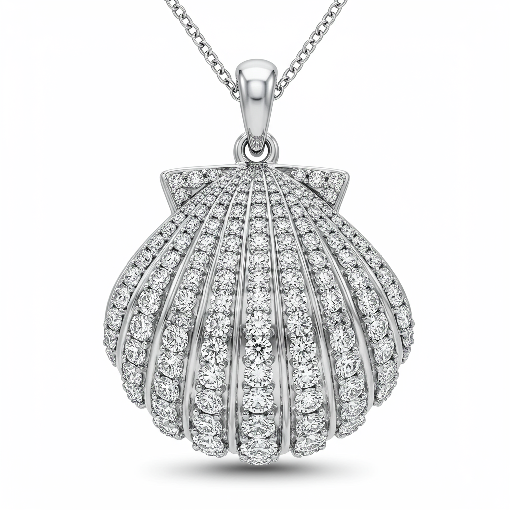 The Seashell Necklace captures the timeless elegance of the ocean in a wearable piece of art. Crafted in lustrous 18KT white gold, the delicate seashell form is meticulously paved with brilliant round diamonds of VVS clarity. This stunning pendant symbolizes natural beauty and coastal allure, hanging gracefully from a fine adjustable chain. It is the perfect statement accessory for sophisticated evening wear or elevated daily elegance.