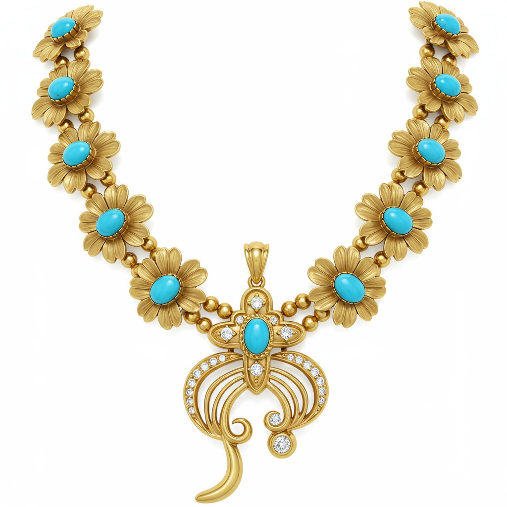 The Squash Blossom Necklace is a majestic homage to Southwestern artistry, reimagined in polished 18KT Yellow Gold. This striking piece features an intricately crafted Naja centerpiece and detailed blossom stations, adorned with substantial turquoise cabochons and shimmering pave-set diamonds. It embodies both heritage and high luxury, draping elegantly as the ultimate statement accessory. This true collector's piece is designed for dramatic effect and timeless admiration.