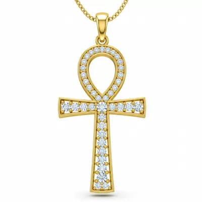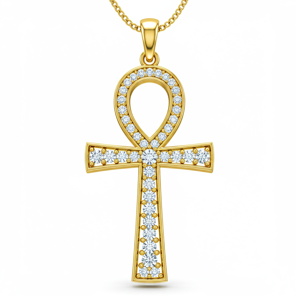 The Ankh Necklace is an exquisite tribute to eternal life, meticulously crafted in rich 18KT yellow gold. This powerful, symbolic pendant is illuminated by a stunning pave setting of VVS G color diamonds, catching light with every subtle movement. Its balanced proportions and flawless finish offer a modern yet timeless expression of ancient power and faith. The piece is suspended from a delicate chain, making it perfect for both daily wear and sophisticated layering. This necklace embodies lasting strength and exceptional luxury.