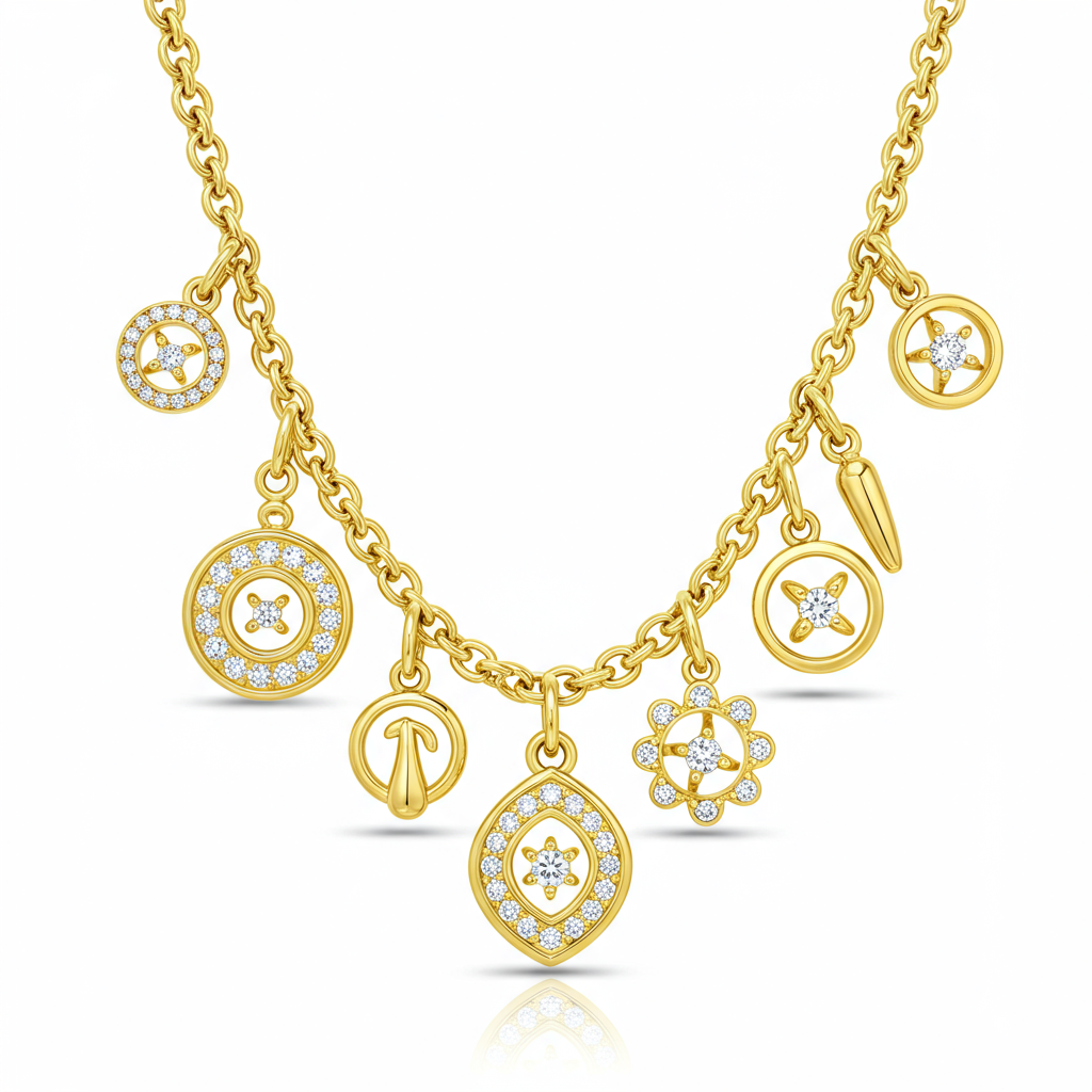 The Charm Necklace collection offers a personalized journey captured in luminous 18KT yellow gold. Each delicate charm is meticulously detailed and micro-pave set with brilliant VVS diamonds, reflecting light with elegant movement. This piece perfectly blends classic luxury with modern self-expression, allowing the wearer to curate their unique narrative. It is secured by a fine, durable chain, making it an ideal signature piece for daily wear or sophisticated layering.