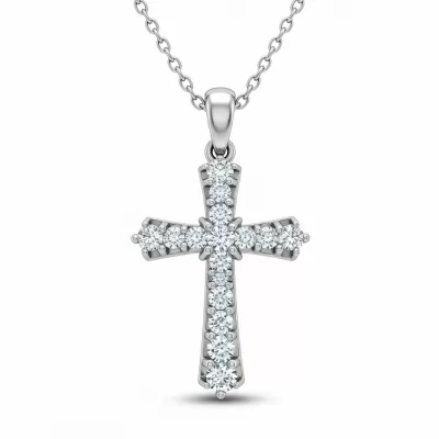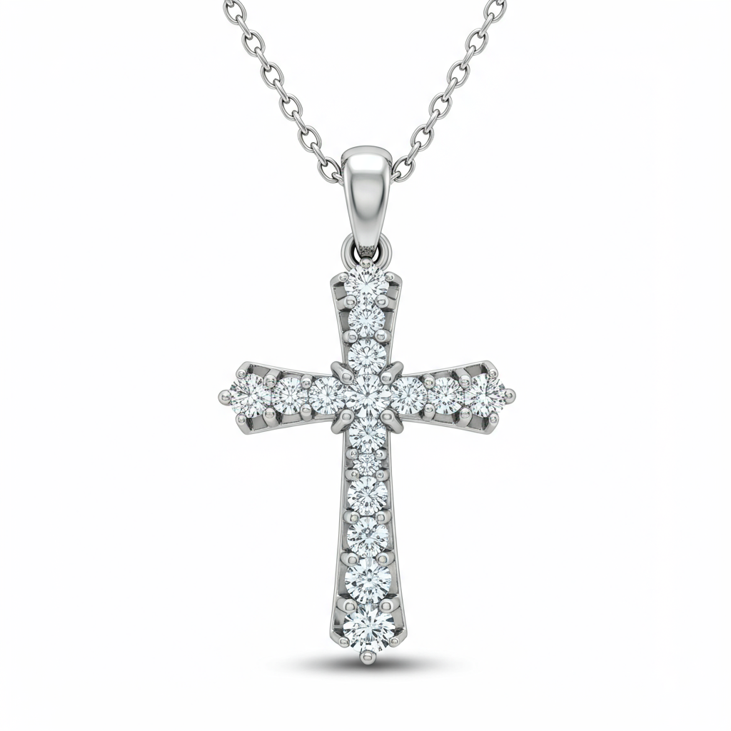 This exquisite Cross And Diamond Necklace is a timeless symbol of faith crafted in radiant 18KT white gold. The delicate cross pendant is meticulously set with brilliant VVS round diamonds, showcasing exceptional sparkle. Suspended from an elegant chain, this piece offers a refined blend of modern luxury and spiritual meaning. It is the perfect heirloom quality accessory for daily wear or special occasions.