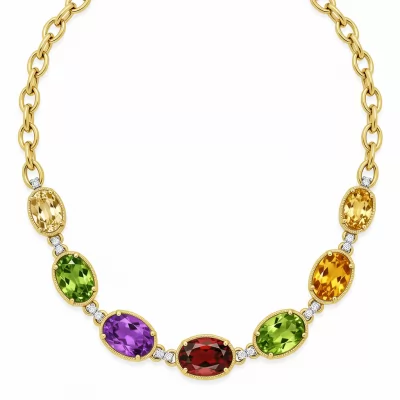 Experience the joyful elegance of the Candy Necklaces, meticulously crafted in radiant 18KT yellow gold. This statement piece features 25 vibrant oval colored gemstones, each separated by delicate links. The design is subtly enhanced with micropavé set accent diamonds, offering a beautiful contrast of color and sparkle. This necklace embodies playful luxury, perfect for those who appreciate high-quality materials and a bold aesthetic.