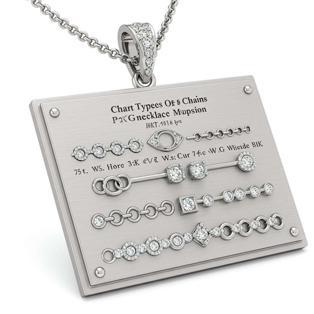 The 'Chart Types Of Necklace Chains' pendant is a sophisticated tribute to the artistry of fine chain making. Crafted in luminous 18KT white gold, this unique piece features miniature, diamond-accented representations of classic chain styles, including Cable, Figaro, and Wheat. Each chain segment is meticulously detailed and set with brilliant round VVS diamonds, showcasing exceptional precision and craftsmanship. This pendant serves as both an elegant statement piece and a stylish educational map of jewelry design heritage.