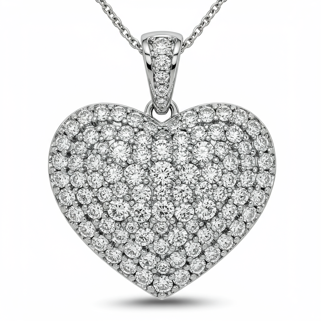 This Gold Diamond Heart Necklace embodies timeless romance and modern luxury. Crafted in exquisite 18KT white gold, the delicate heart silhouette is illuminated by a meticulous array of VVS pave diamonds, catching light from every angle. It hangs gracefully from a fine cable chain, making it the perfect everyday signature piece or a cherished gift. This pendant symbolizes enduring love and sophistication.