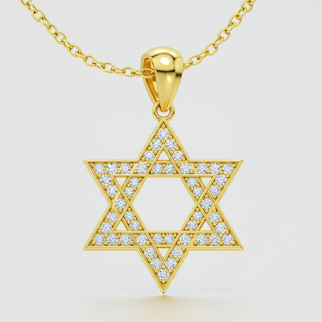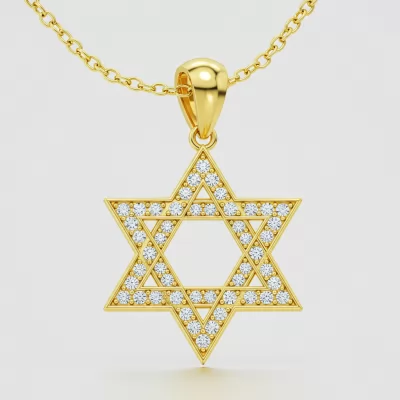 The Gold Star of David Necklace is an exquisite symbol of faith crafted in radiant 18KT yellow gold. This iconic pendant features a delicate micro-pave setting, highlighting 40 meticulously placed VVS diamonds along its geometric contours. The timeless design captures the light with every movement, offering a brilliant and meaningful sparkle. Suspended from a slender chain, this piece serves as a sophisticated testament to heritage and elegance, perfect for daily wear or special occasions.