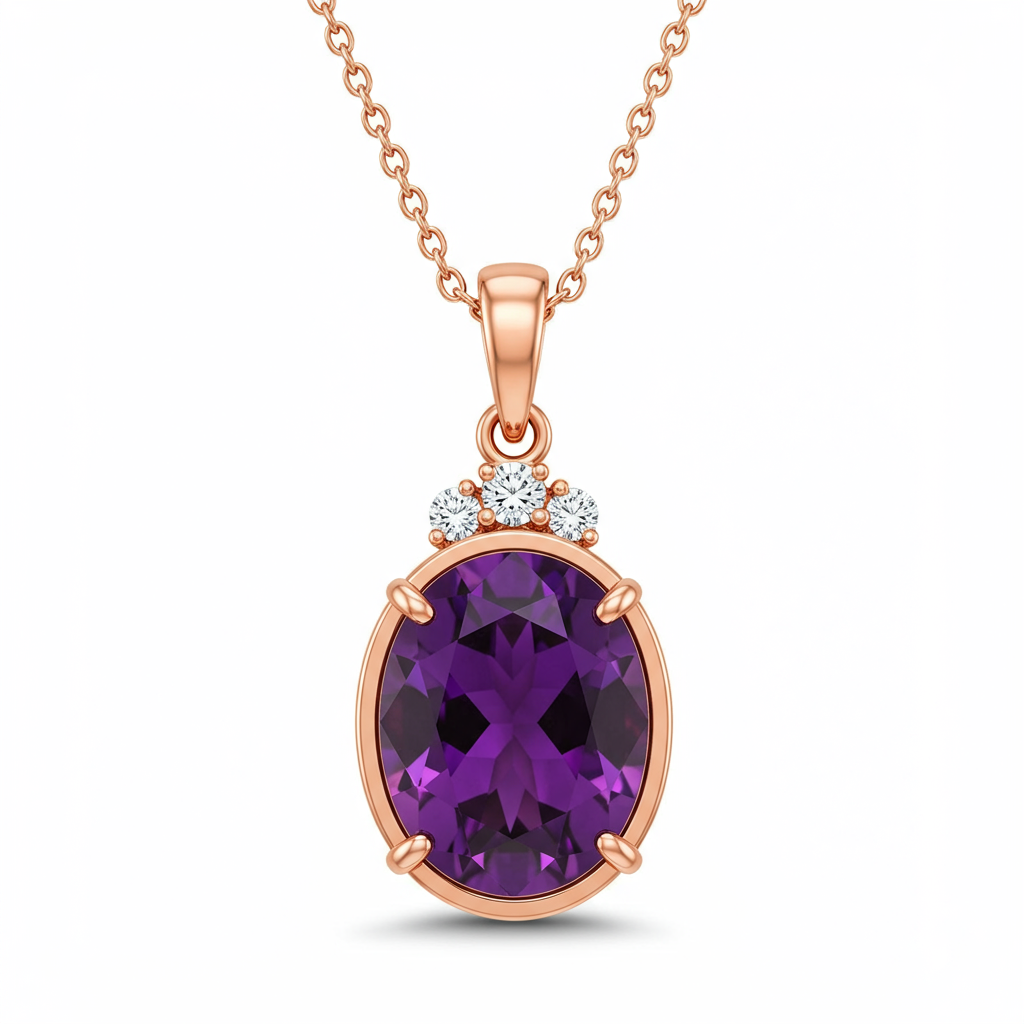 The iconic Elisa Pendant design is reimagined here in luxurious 18KT rose gold, offering a modern classic for the discerning wearer. It features a prominent oval-cut Amethyst set within a smooth bezel, radiating a deep, mesmerizing purple hue. Subtle VVS diamond accents are meticulously placed on the delicate bail, adding a refined touch of brilliance. This piece elegantly merges casual versatility with high-end craftsmanship, making it perfect for both daily wear and special events.