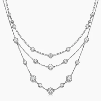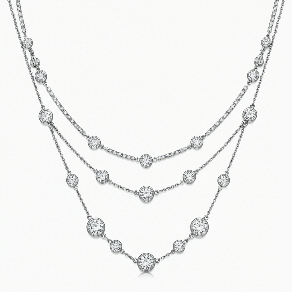 The Layered Necklace epitomizes modern elegance, featuring two distinct diamond-set chains crafted in lustrous 18KT white gold. The upper layer showcases delicate micro-pave detailing, while the lower strand is adorned with larger, individually set brilliant diamonds for maximum sparkle. This piece offers effortless sophistication, designed to provide the illusion of perfectly paired necklaces without the hassle of tangling. It is a stunning statement accessory suitable for both formal events and elevated daily wear, embodying contemporary luxury.