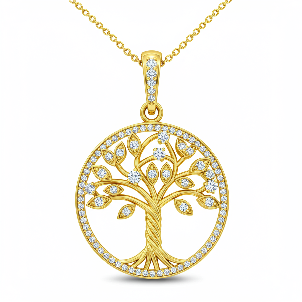 The Necklace Life Tree pendant symbolizes growth, harmony, and eternal connection, making it a powerful emblem of personal journey. Crafted in lustrous 18KT yellow gold, this intricate design features delicate, detailed branches entirely lined with brilliant round diamonds set in micro-pave. The high-polish metal perfectly contrasts with the stunning brilliance of the stones, creating a piece of enduring strength and beauty. It is an ideal luxury accessory for commemorating significant milestones or celebrating profound personal beliefs.
