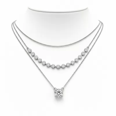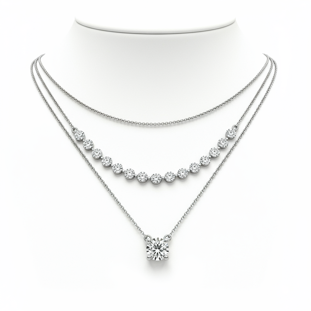 The Layering Necklaces set offers effortless elegance, combining two distinct diamond strands crafted in luminous 18KT white gold. The shorter strand features ten perfectly spaced VVS round diamonds creating a delicate station effect. The longer chain showcases a stunning 0.40 carat solitaire, providing brilliant focal point. Designed for versatility, this set delivers a contemporary, luxurious look perfect for everyday wear or sophisticated evening events.