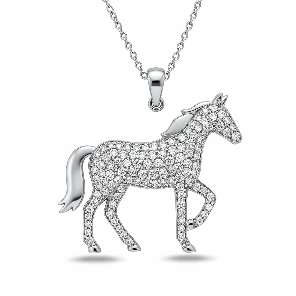 This majestic pendant captures the spirit of the noble horse, meticulously rendered in gleaming 18KT white gold. The fluid lines of the horse's silhouette are completely paved with scintillating VVS natural diamonds, offering unparalleled brilliance. It is a stunning piece that symbolizes strength, freedom, and elegance, suspended from a delicate yet sturdy cable chain. This statement necklace serves as a luxurious talisman for the wearer, perfect for daily wear or special occasions.