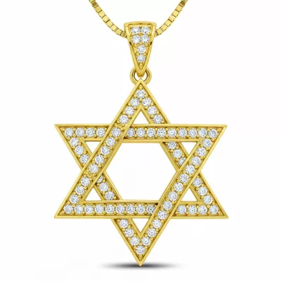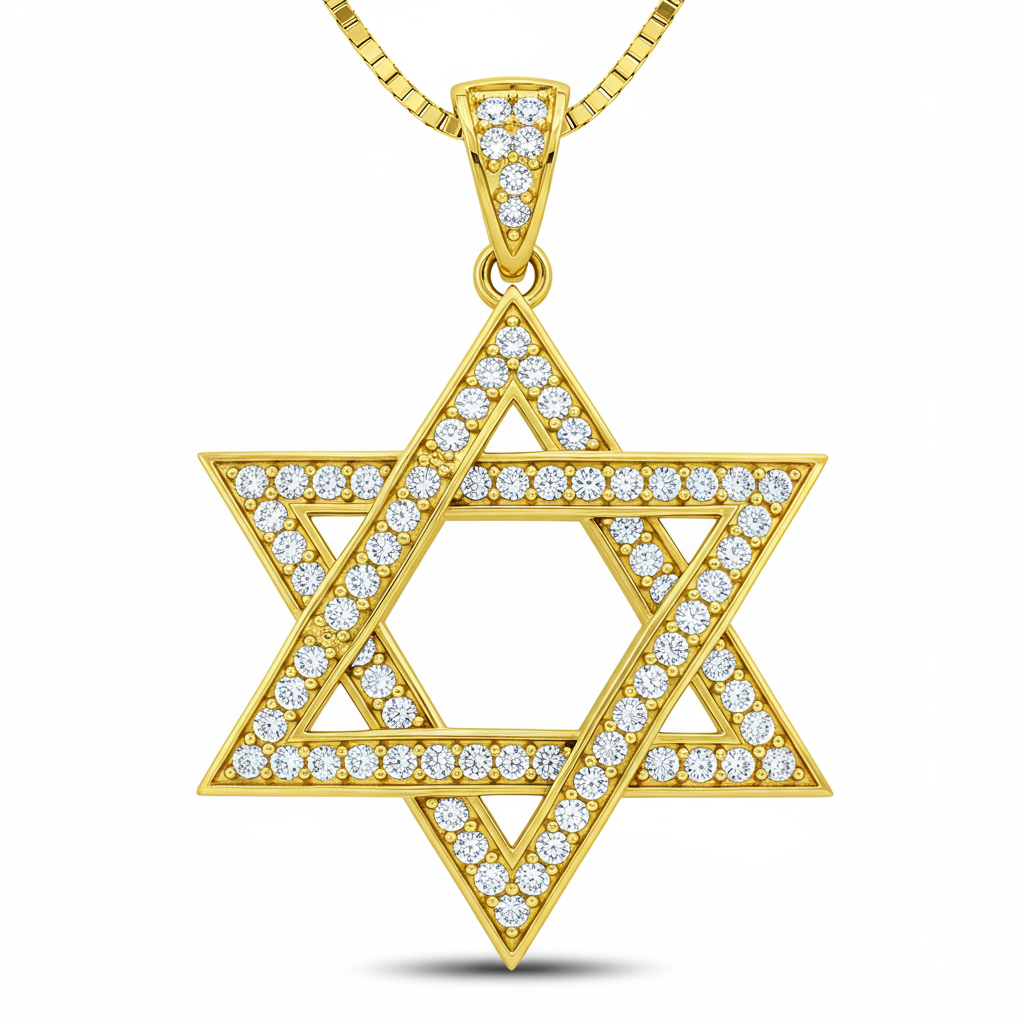 This exquisite Magen David necklace captures spiritual elegance in brilliant 18KT yellow gold. The iconic six-pointed star silhouette is entirely adorned with meticulously set, VVS clarity round diamonds in a dazzling pave setting. This timeless piece serves as a beautiful symbol of faith and identity, crafted with superior precision and luxurious detail. Suspended from a delicate matching chain, it offers magnificent everyday radiance.