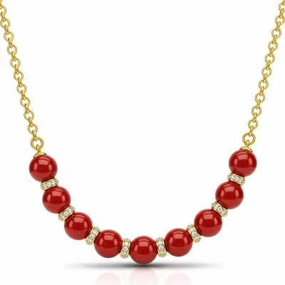 This exquisite station necklace combines the vibrant allure of polished red beads with the subtle brilliance of fine diamonds. Crafted in luxurious 18KT yellow gold, this piece features perfectly spaced diamond-set stations alternating with smoothly polished red accents along a delicate chain. The design offers a modern yet timeless expression of elegance and rich color contrast. This striking piece is versatile, perfect for layering or wearing solo as a statement accessory.