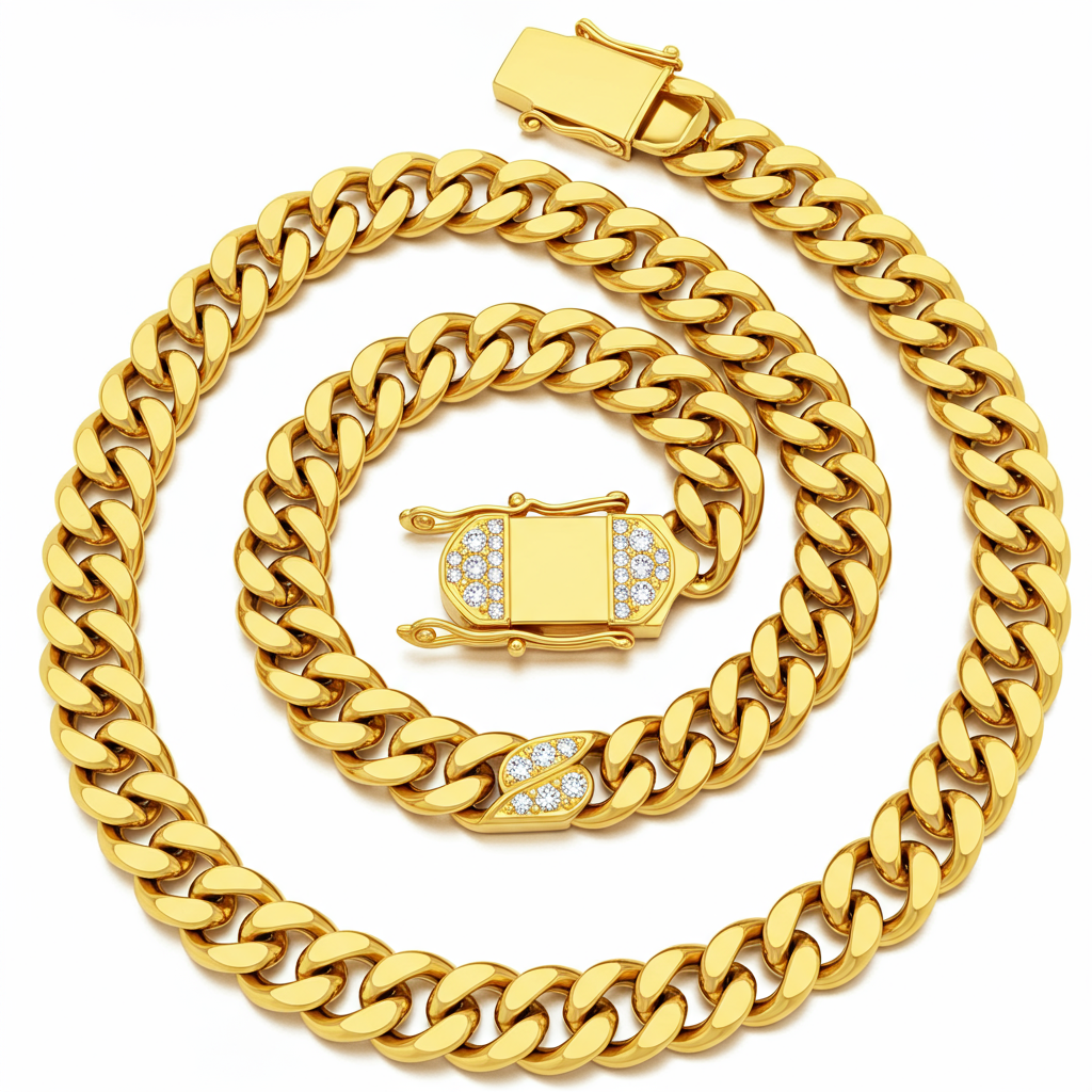 The Mens Gold Necklace is a testament to masculine luxury, featuring heavy, interlocking links crafted from substantial 18KT yellow gold. Its robust design provides a confident drape and exceptional durability, making it perfect for daily wear or elevated occasions. Five meticulously set VVS diamonds subtly adorn the clasp, adding a flash of discreet brilliance without compromising the chain's powerful silhouette. This piece is designed for the modern connoisseur who appreciates precision engineering and enduring style.