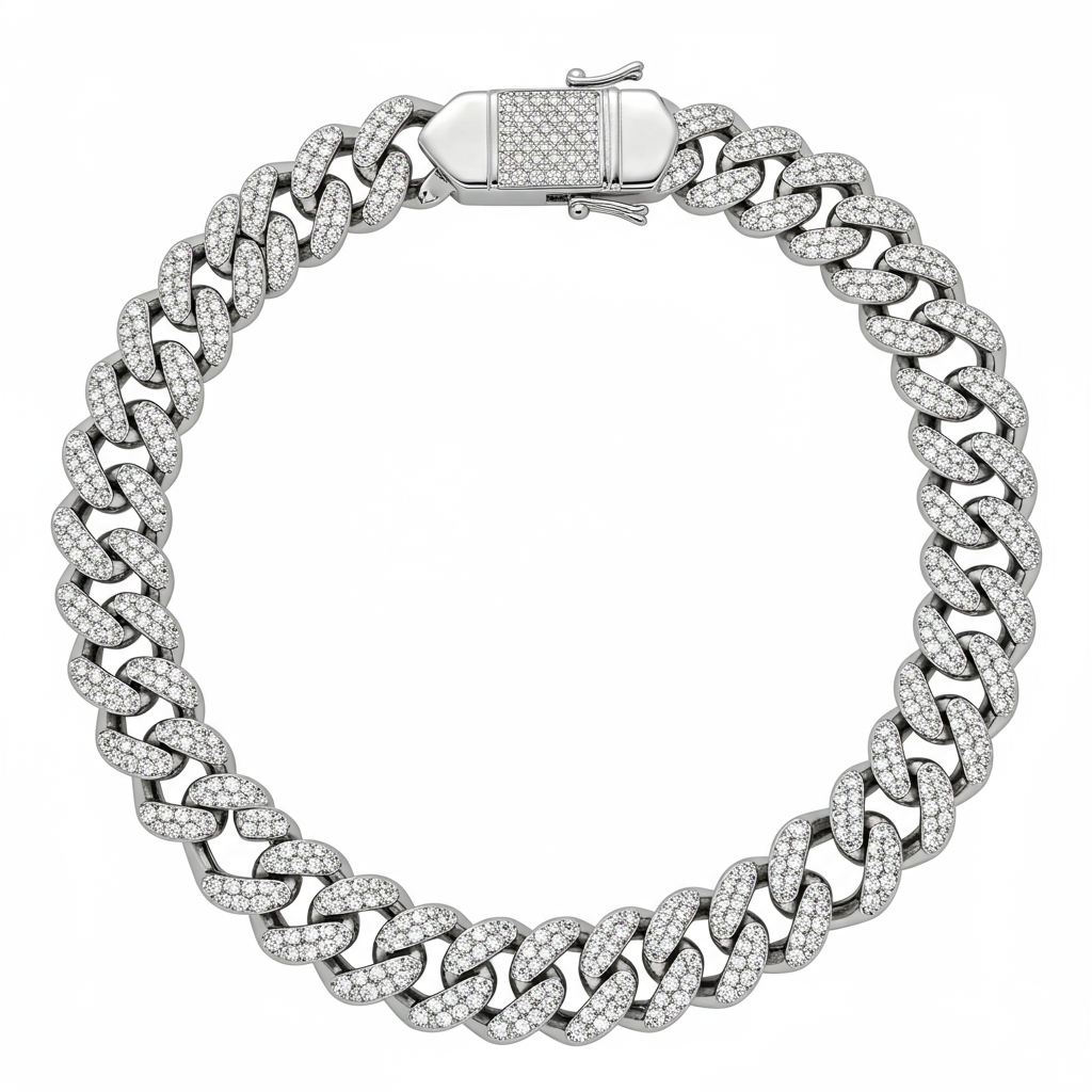 The ultimate statement of masculine elegance, this diamond-encrusted Cuban Link Necklace redefines high-end luxury jewelry. Crafted in weighty 18KT white gold, the robust links are meticulously set with brilliant VVS diamonds. This exceptional piece merges classic bold design with flawless high-jewelry craftsmanship and incredible sparkle. Wear it to command attention and signify unparalleled style and success.