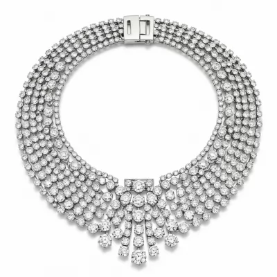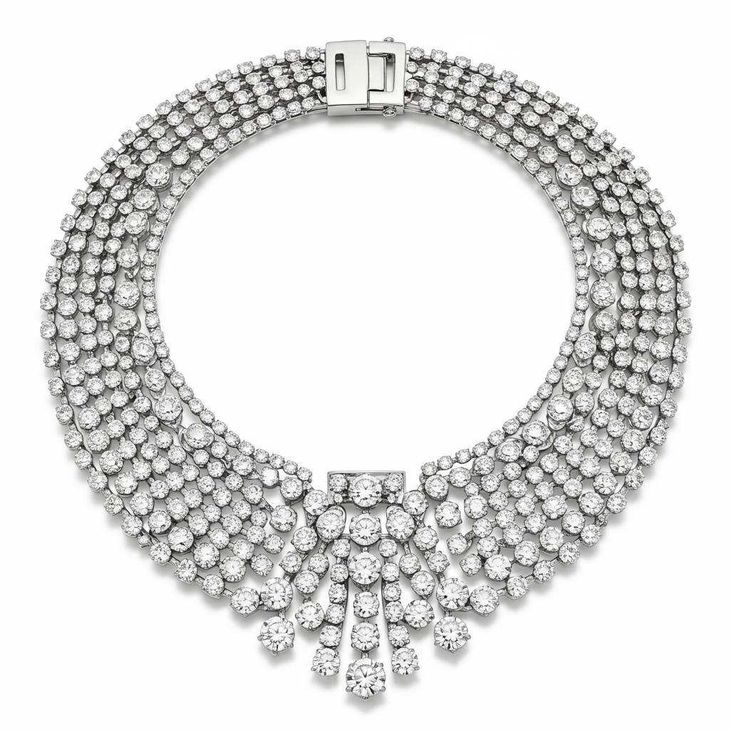 This exquisite Statement Necklace is crafted in luxurious 18KT white gold, designed to command immediate attention. It features a cascade of brilliantly cut VVS and VS diamonds meticulously set in an intricate, flowing pattern that drapes elegantly around the collar. The substantial design offers unparalleled sparkle and sophistication, making it the definitive centerpiece for any grand occasion or gala event. This heirloom-quality necklace seamlessly blends timeless elegance with modern architectural artistry, ensuring it becomes a treasured piece for generations.