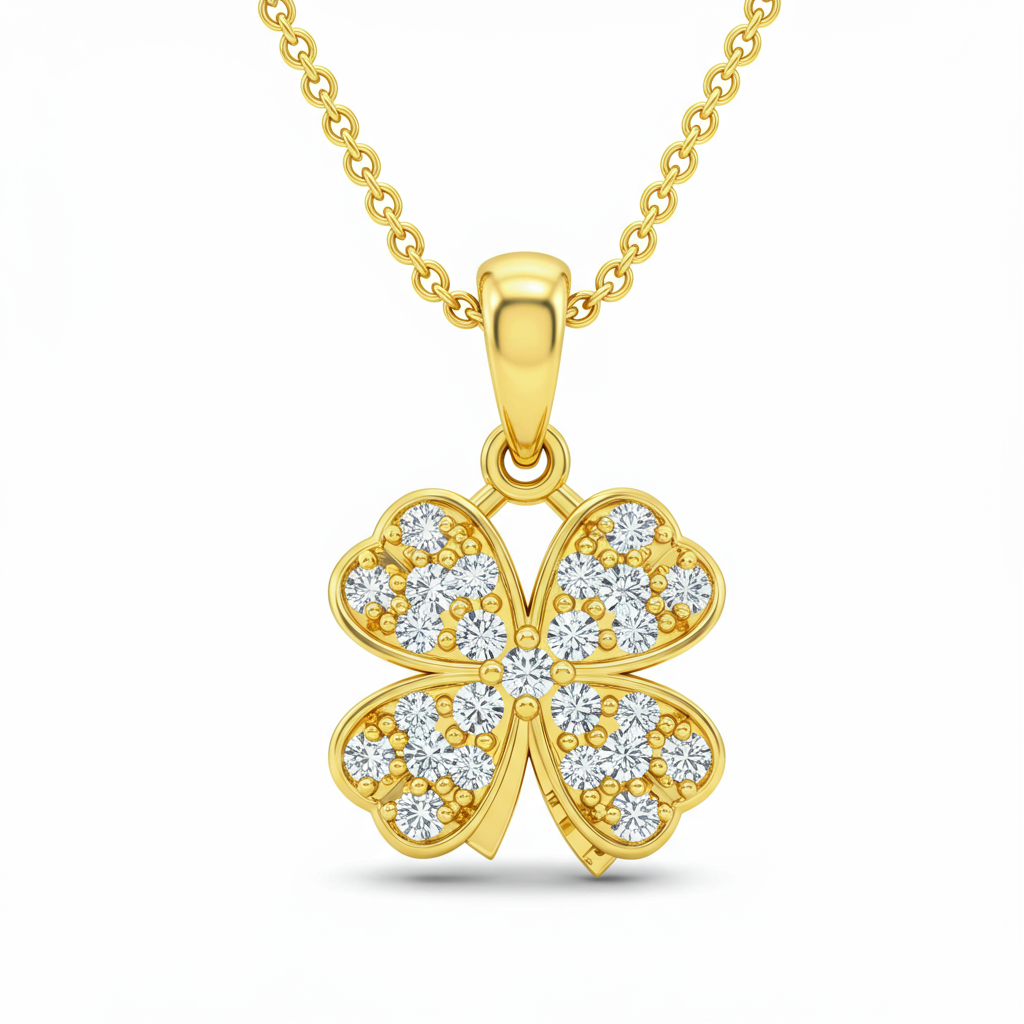 Inspired by timeless elegance, the Van Cleef Gold Necklace features an exquisite clover motif symbolizing luck and fortune. Crafted in radiant 18KT yellow gold, the contours of the pendant are meticulously detailed. The central structure is framed by a delicate border of pavé-set diamonds, offering spectacular brilliance. This piece hangs from a slender adjustable chain, making it the perfect everyday luxury accessory.