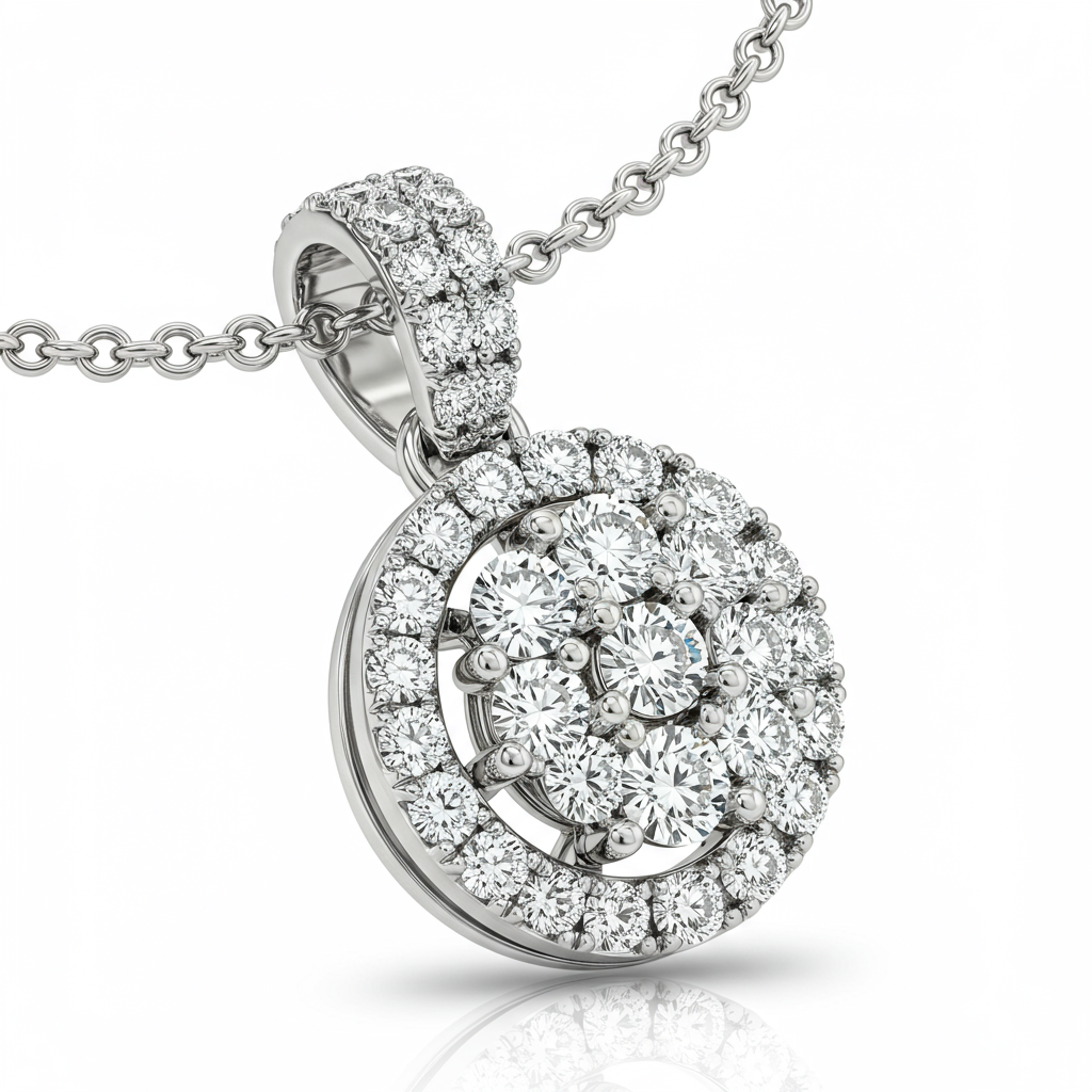 This exquisite Diamond Cluster Halo Pendant epitomizes modern elegance and brilliance. Crafted in lustrous 18KT white gold, the design features a central cluster of VVS diamonds surrounded by a delicate halo, maximizing light reflection. The seamless integration of precision-set stones creates the illusion of a single, magnificent stone, ensuring maximum sparkle. This piece is perfect for adding refined glamour to any evening attire or formal occasion.
