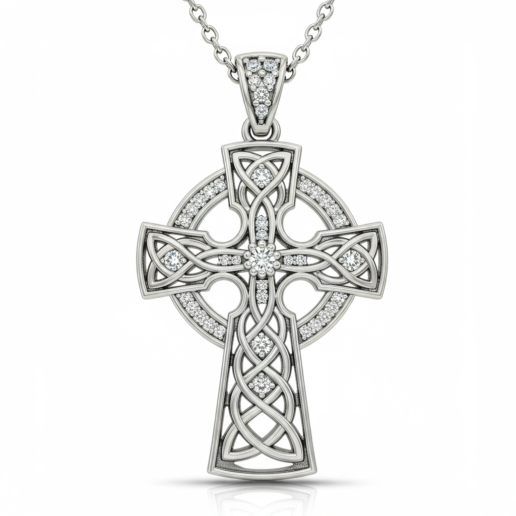 This magnificent Celtic Cross Necklace is a timeless symbol of faith and heritage, meticulously crafted in radiant 18KT white gold. The classic cross structure features intricate knotwork details, highlighted by a constellation of brilliant round diamonds set along the arms. This piece seamlessly merges ancient mysticism with contemporary elegance, creating a stunning heirloom suitable for daily wear or special occasions. It is suspended from a delicate yet durable chain, ensuring it rests perfectly against the collarbone.