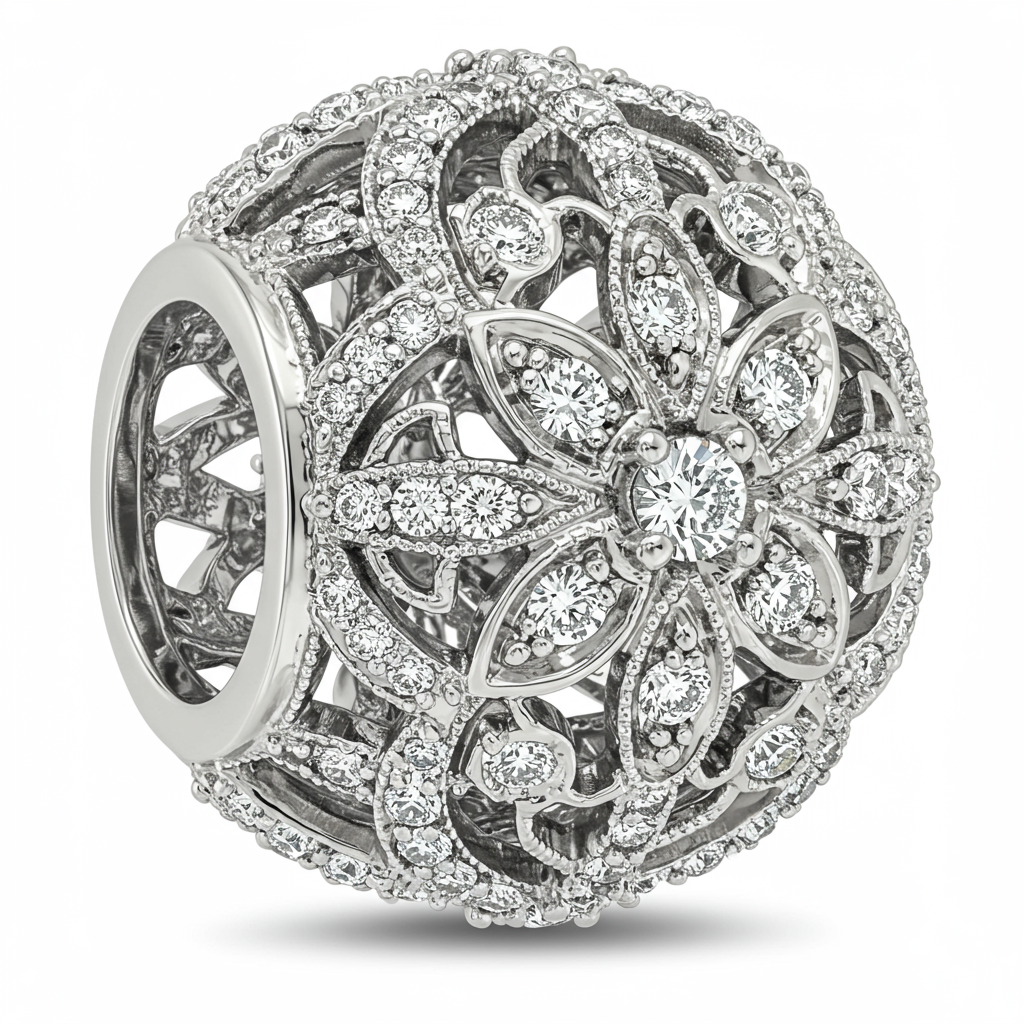 This exquisitely crafted dangle charm elevates any necklace collection with its delicate design and superior diamond setting. Forged in lustrous 18KT white gold, the charm features intricate filigree work accented by brilliant micro-pave diamonds. Its sophisticated movement catches the light beautifully, offering continuous sparkle and enhancing the elegance of your existing jewelry pieces. This charm is a timeless statement of luxury and personal style, perfect for marking a special occasion.