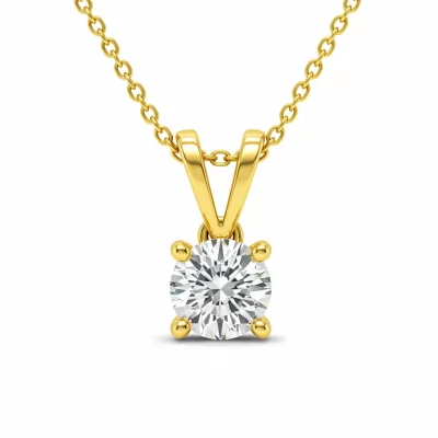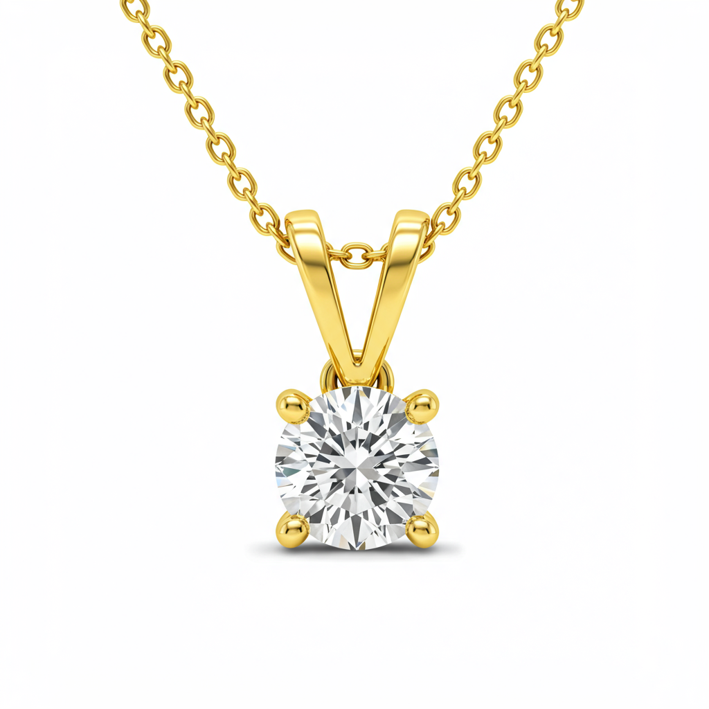 This exquisite solitaire pendant necklace redefines everyday luxury. Crafted in radiant 18KT yellow gold, it features a brilliant round diamond held securely in a classic four-prong setting. The stone boasts exceptional VVS clarity and G color, ensuring maximum brilliance and fire. Suspended from a delicate adjustable chain, this piece is designed for timeless elegance and effortless wear, making it the perfect signature item for any woman.