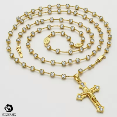 This exquisite Gold Rosary Necklace elevates traditional symbolism through refined craftsmanship and brilliant diamonds. Crafted in luxurious 18KT yellow gold, the delicate chain features precisely spaced diamond-encrusted beads leading to a meticulously detailed cruciform pendant. Each VVS diamond bead captures light beautifully, lending a subtle, radiant shimmer to this devotional piece. It serves as both a profound statement of faith and a stunning piece of everyday high jewelry, designed for lasting elegance and spiritual significance.