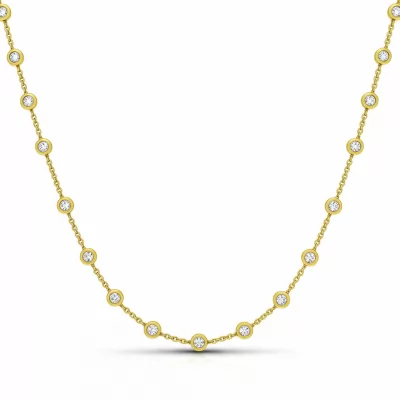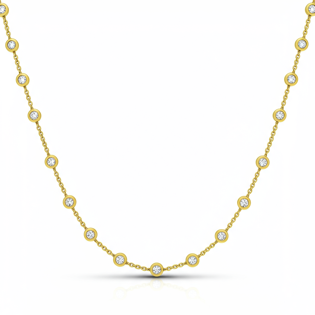 The Long Long Necklace epitomizes effortless elegance, featuring a delicate 18KT yellow gold chain designed for versatile layering. Throughout its considerable length, forty bezel-set round brilliant diamonds sparkle, providing subtle yet captivating movement. This piece is perfect for creating a sophisticated, elongated silhouette, whether worn alone or doubled up for a shorter, statement look. It offers modern luxury crafted for everyday, high-end wear.