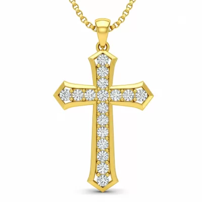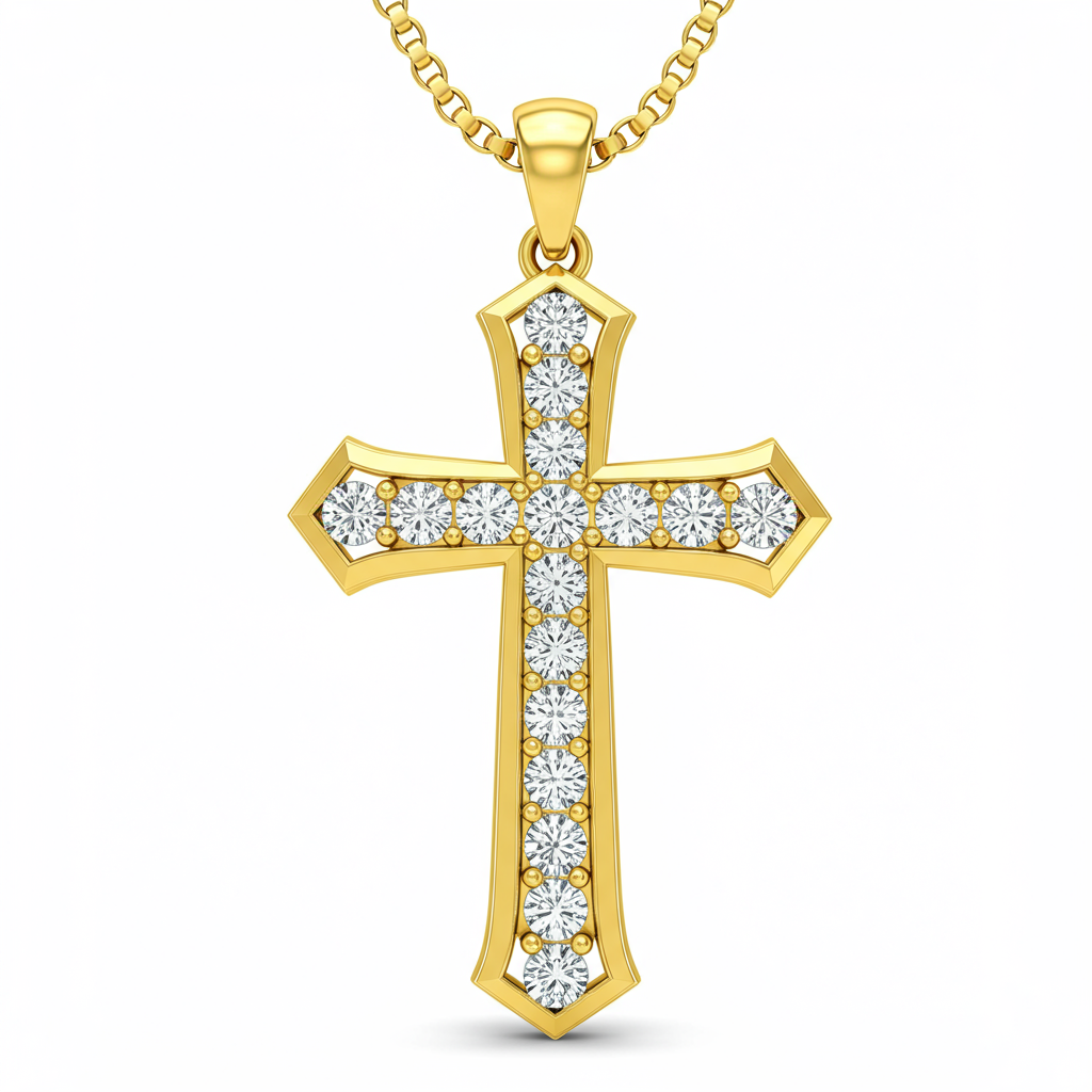 This iconic Men's Gold Cross Necklace is a statement of faith crafted with superior precision and luxurious materials. The bold, substantial silhouette is rendered in rich 18KT yellow gold, offering unmatched durability and luster. It features a stunning pave setting, meticulously set with high-clarity VVS diamonds that capture and reflect light brilliantly. This pendant serves as a powerful, elegant accessory, perfectly suited for the discerning modern gentleman.