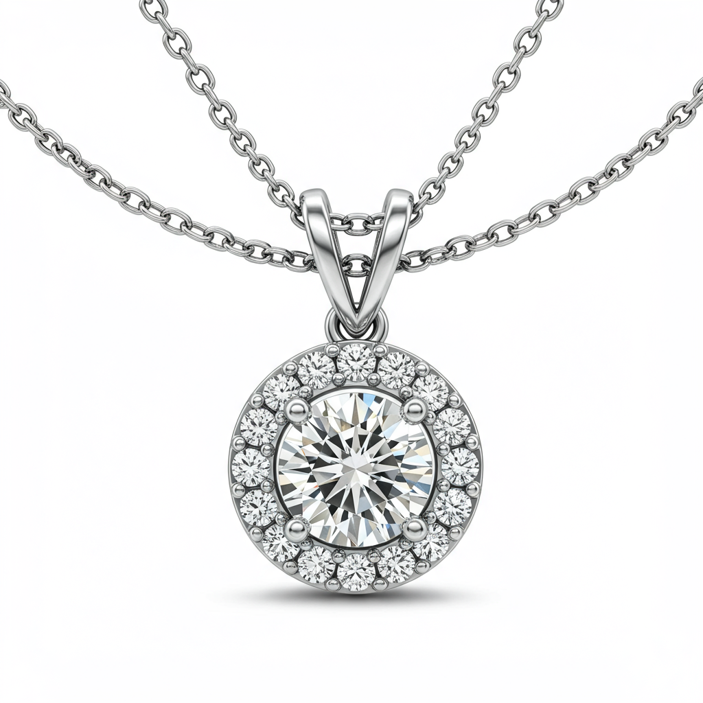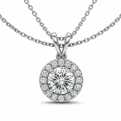 This elegant diamond halo solitaire pendant necklace is the ultimate expression of devotion. Crafted in luminous 18KT white gold, the central brilliant-cut diamond is encircled by a delicate micro-pave halo, enhancing its radiance and perceived size. Suspended from a slender chain, this piece rests gracefully against the collarbone, symbolizing everlasting love. It is a timeless gift designed to be cherished for a lifetime.
