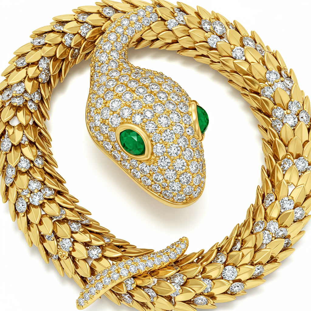 The Snake Necklace is a masterpiece of fluid design, capturing the primal elegance of the serpent. Crafted in radiant 18KT yellow gold, the meticulously articulated coil drapes elegantly around the wearer's neck. This statement piece is entirely paved with brilliant VVS diamonds, mimicking the shimmering scales of the snake. Two vibrant emerald eyes complete the lifelike detail, symbolizing transformation and eternal grace.