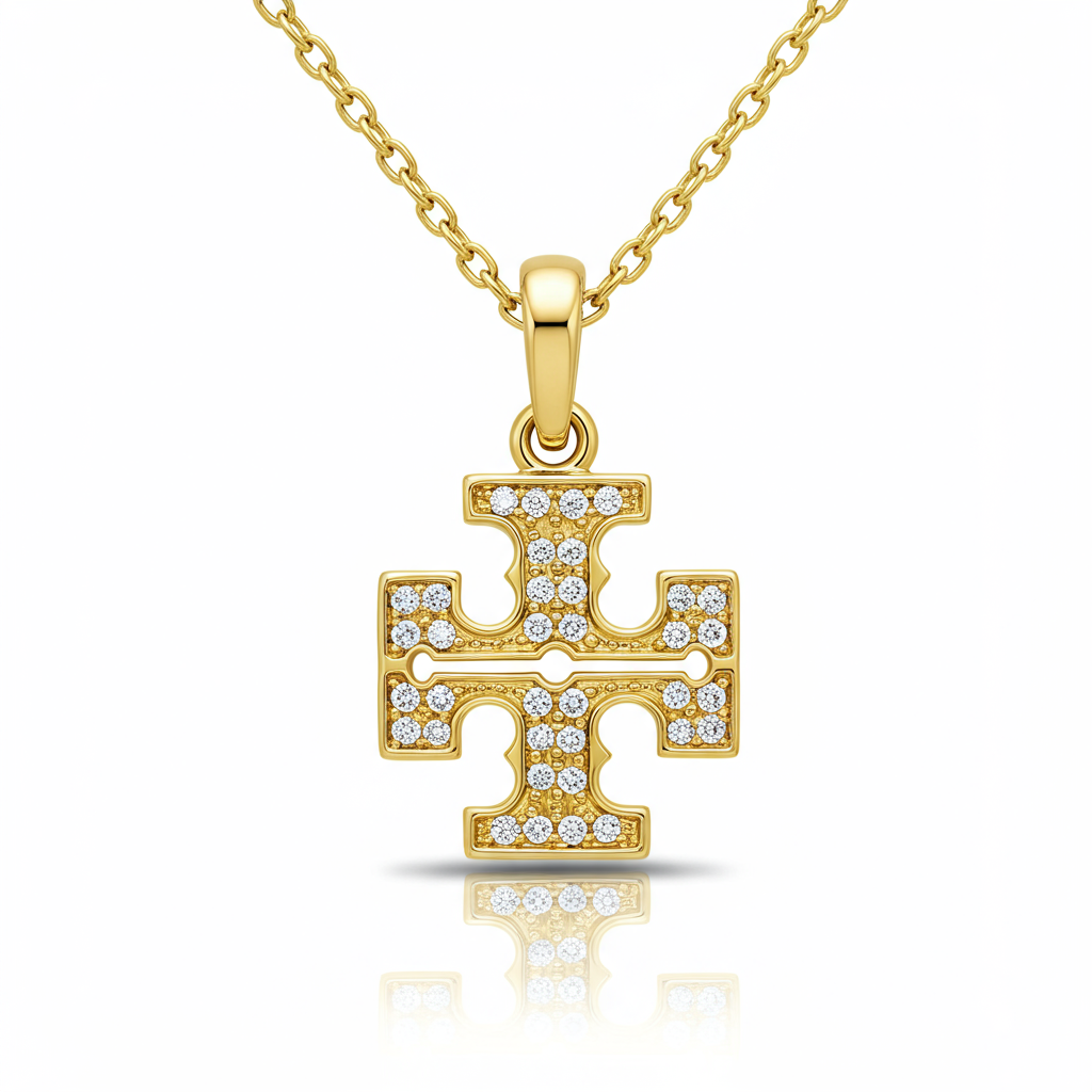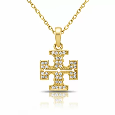 The Tory Burch Necklace reimagines the iconic double-T logo into a sophisticated diamond pendant. Crafted in radiant 18KT yellow gold, the contours are meticulously traced with micro-pave VVS diamonds. This elegant piece hangs from a delicate link chain, offering a perfect blend of modern style and timeless luxury. It serves as an effortless statement accessory suitable for both day and evening wear.