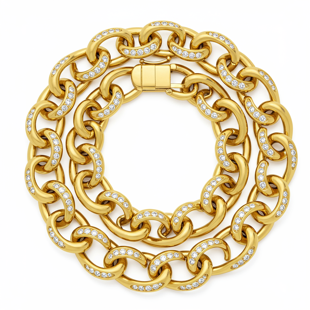 The Chunky Necklace is a magnificent expression of contemporary luxury and bold design. Crafted in rich 18KT gold, this statement piece features substantial, highly polished interlocking links that create a commanding silhouette. Scattered VVS diamonds are meticulously set flush along select links, adding unexpected brilliance to the heavy structure. This necklace is designed to be the focal point of any ensemble, expertly blending classic fine metalwork with modern maximalist trends.