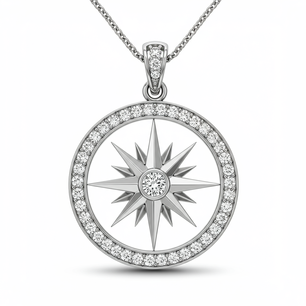 The Compass Necklace guides your journey with timeless elegance and precision. Crafted in luminous 18KT white gold, this pendant features a central brilliant-cut diamond encircled by a meticulously detailed pave setting resembling a cardinal rose. Its modern yet meaningful design symbolizes direction and purpose, blending luxury with deep personal significance. Suspended from a delicate chain, this piece is perfect for daily wear or as a thoughtful gift for life's explorers.