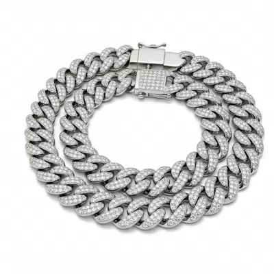 This extravagant Cuban Link Necklace redefines classic hip-hop luxury, crafted in solid 18KT white gold. Each substantial link is meticulously micro-paved with hand-set VVS natural diamonds, ensuring a breathtaking, continuous stream of brilliance. Weighing heavily on the neck, this piece delivers an unmistakable statement of wealth and sophistication. The seamless closure system guarantees security while maintaining the chain's fluid, structural integrity.