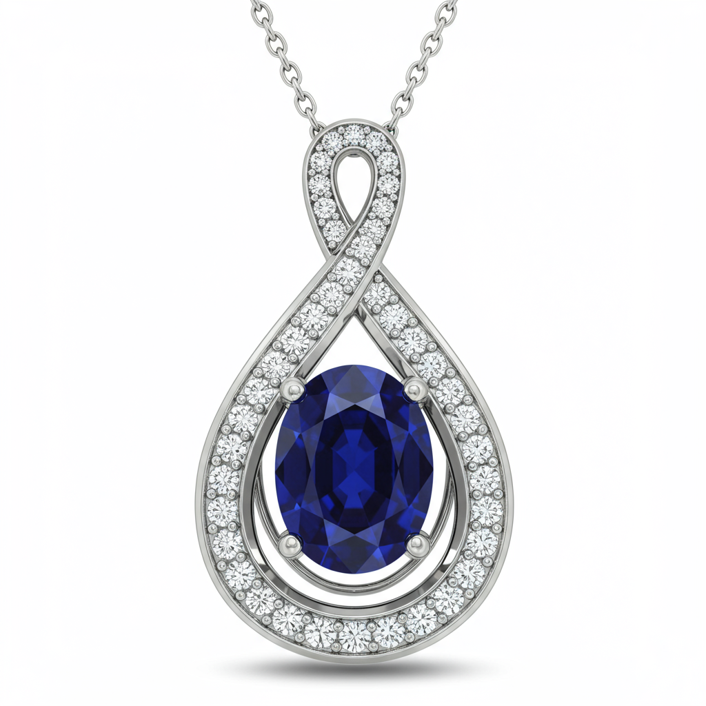 This exquisite Gemstone Necklace features a vibrant, centrally-set oval blue sapphire embraced by a brilliant halo of meticulously placed VVS diamonds. Crafted in luxurious 18KT white gold, the design harmoniously blends classic elegance with modern precision. The pendant drapes perfectly on the neckline, ensuring maximum sparkle and sophisticated presence. This piece is a true statement of enduring luxury and expert craftsmanship.