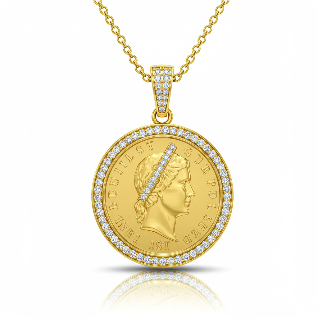 The Gold Coin Necklace is a tribute to timeless heritage, meticulously crafted in rich 18KT yellow gold. This exquisite piece features a substantial circular coin pendant, intricately bordered by a scintillating halo of micro-pave set VVS diamonds. The classic silhouette is balanced by modern brilliance, making it a powerful statement of elegance and history. Suspended from a delicate yet durable chain, this necklace is designed to be a cherished heirloom for generations.