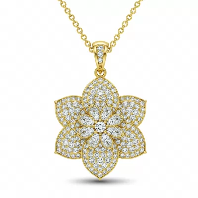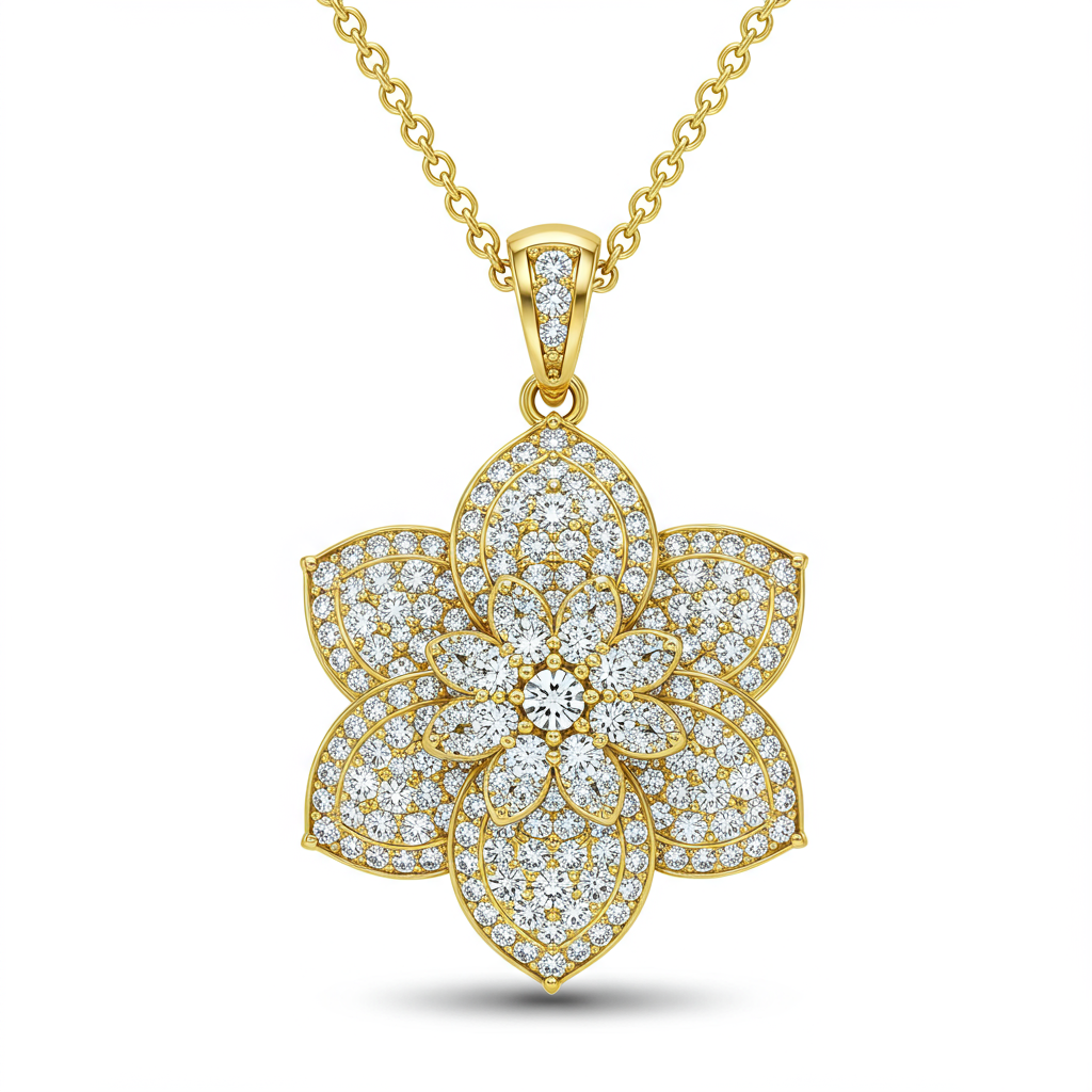 The Hawaiian Necklace captures the vibrant spirit of the islands in a luxurious display. Crafted in radiant 18KT yellow gold, this sophisticated pendant features a delicate floral cluster design, symbolizing tropical elegance and natural beauty. Each element is meticulously paved with brilliant VVS quality diamonds, reflecting light with mesmerizing intensity. This exceptional piece hangs gracefully from a fine chain, offering an exquisite statement of refined luxury perfect for any occasion.