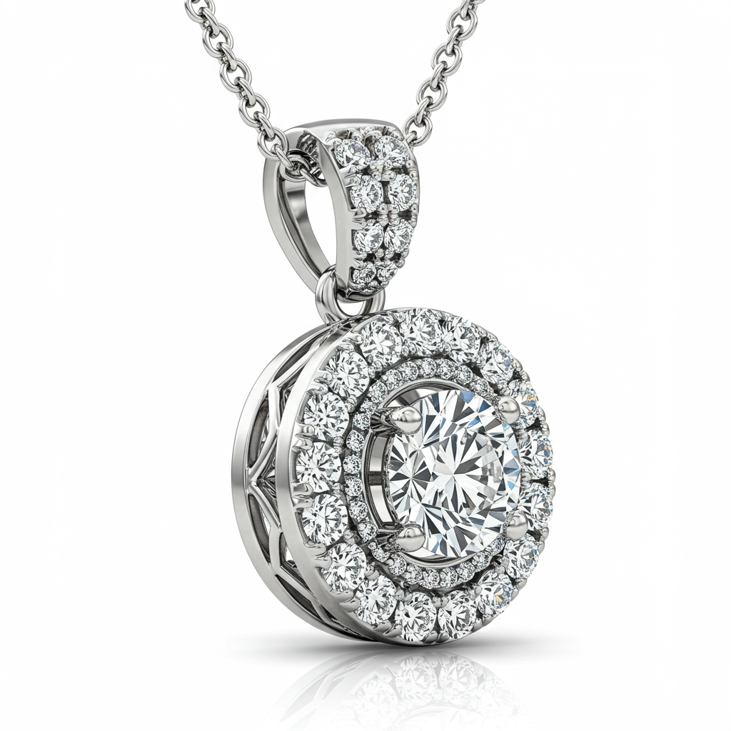This exquisite pendant necklace is the embodiment of timeless romance and sophisticated brilliance, featuring a central 1.00 carat VVS diamond framed by a brilliant halo of accent stones. Crafted meticulously in 18KT white gold, the design maximizes light return for unparalleled sparkle. The substantial net weight and delicate chain balance luxury with wearability, making it ideal for daily elegance or significant evening wear. This iconic piece captures the classic aesthetic beloved by high-end jewelry connoisseurs.